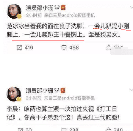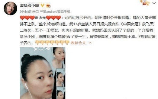 在近日,演员邵小珊更是发文支持崔永元,曝出范冰冰更多猛料,称其刚出道时公开报价陪睡,自曝是范冰冰导致自己婚姻恋爱不幸。