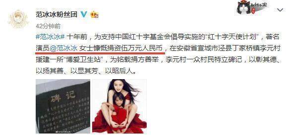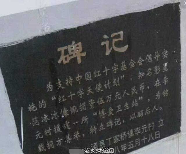 面对他们的讨伐爆料,昨天范冰冰粉丝团就发布消息称,十年前范冰冰捐款五万块钱支持中国红十字会提出的天使计划,帮助安徽某个农村建立了一所“博爱卫生站”,因此村民特意为范冰冰立了一块碑文感谢。